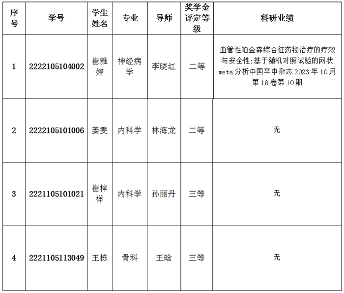 根据《大连医科大学研究生学业奖学金管理暂行办法要求》,经学生本人申请,大连市友谊医院奖学金评审委员会审核,现将我院2024年大连医科大学研究生奖学金获奖学生进行公示。