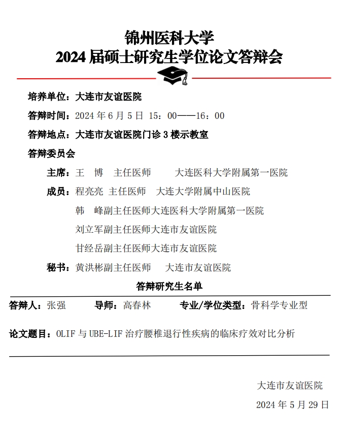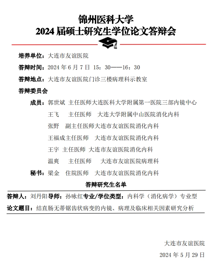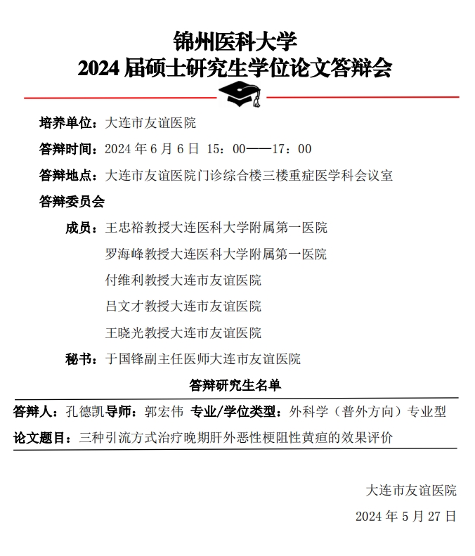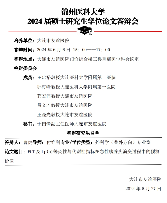锦州医科大学2024年硕士研究生答辩公示