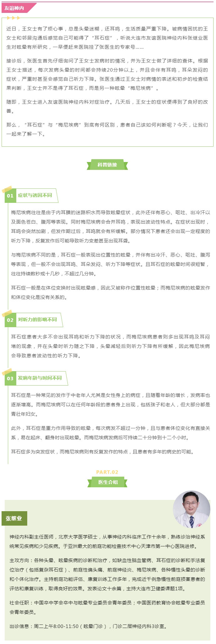 导读:【友谊神内】“耳石症”的晕,“梅尼埃病”的晕,你分的清吗?