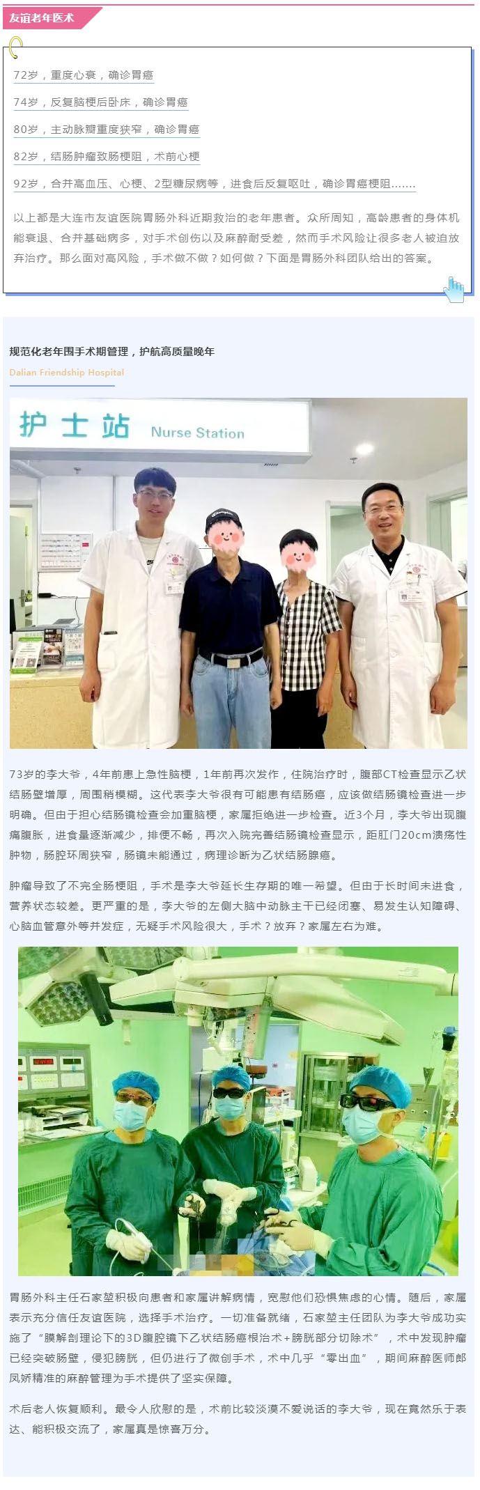 导读:【友谊老年医术】脑梗、心梗的高龄老人,有胃肠道肿瘤应该手术吗?