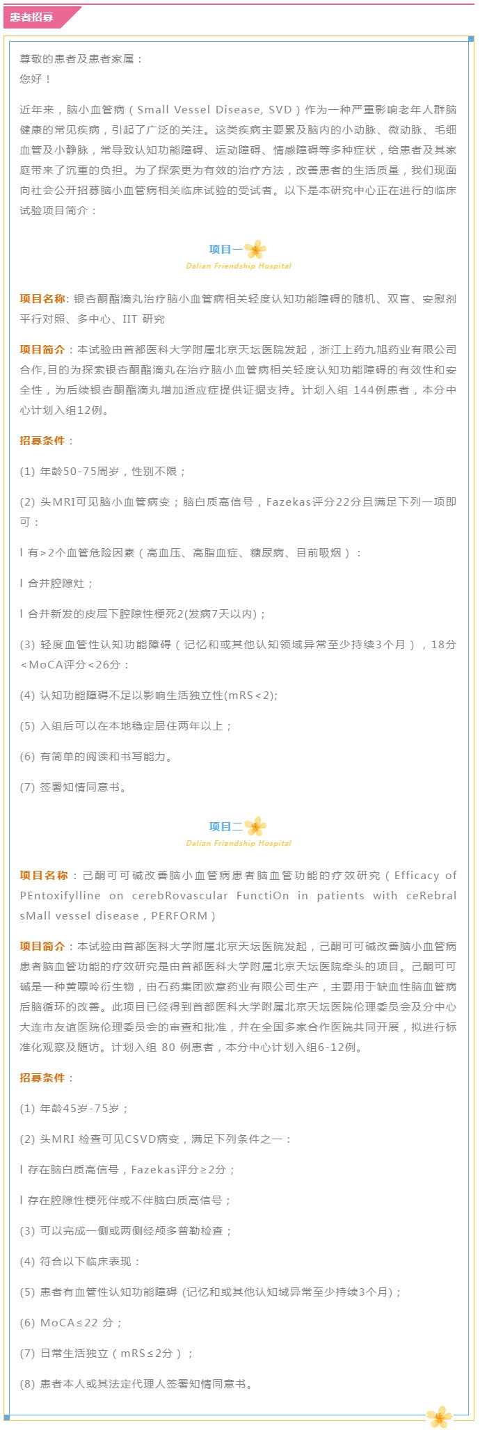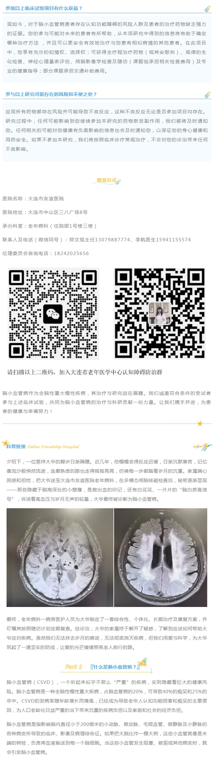 大连市友谊医院、大连市老年病临床医学研究中心脑小血管病临床试验招募公告