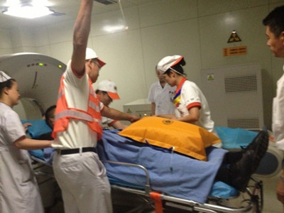 此次演练模拟1名保健对象在国际会议中心突发脑血管病的医疗救治全过程,保健对象随员发现患者不适后立即与我院医务室医疗保健人员吴鹤医生取得联系;吴鹤医生与于杰护士携带抢救设备迅速赶往现场进行救治,初步诊断为急性脑血管病,通知医疗急救人员患者需要转运至定点医院,同时将病情电话报告市卫生局干部保健处;救护车医疗急救人员携带急救设备快速到达患者房间,在与吴鹤医生交接后对患者实施了搬抬、固定、转移上车,全程安全平稳,5分钟后到达我院C座行脑CT检查;根据之前电话沟通,院内保健组成员和影像科人员早已做好了接诊准备,将患者接入CT室进行检查,检查后转运至定点病房。演练结束后,参与演练的全体人员在我院议室进行演练总结,查找了演练过程中存在问题和不足。