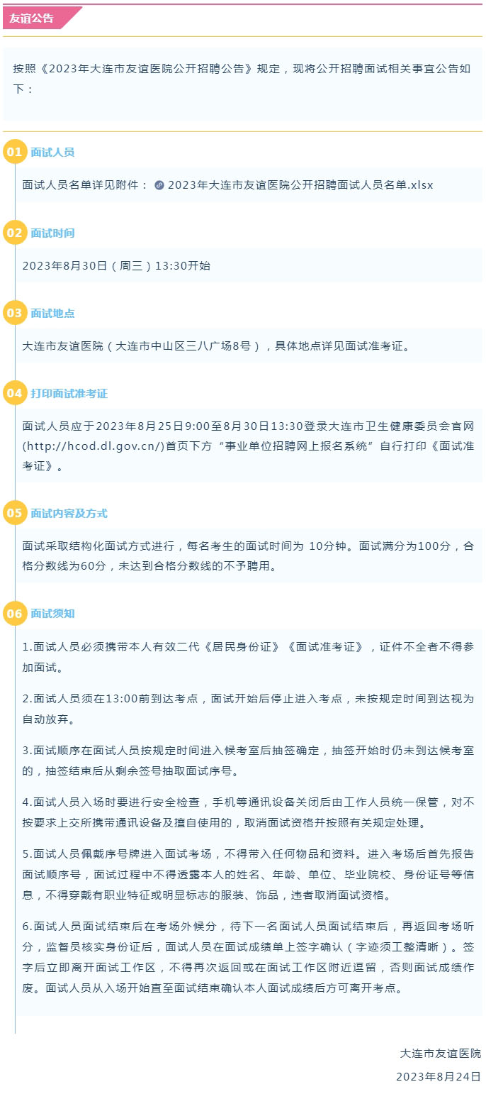 导读:【友谊公告】2023年大连市友谊医院公开招聘面试公告