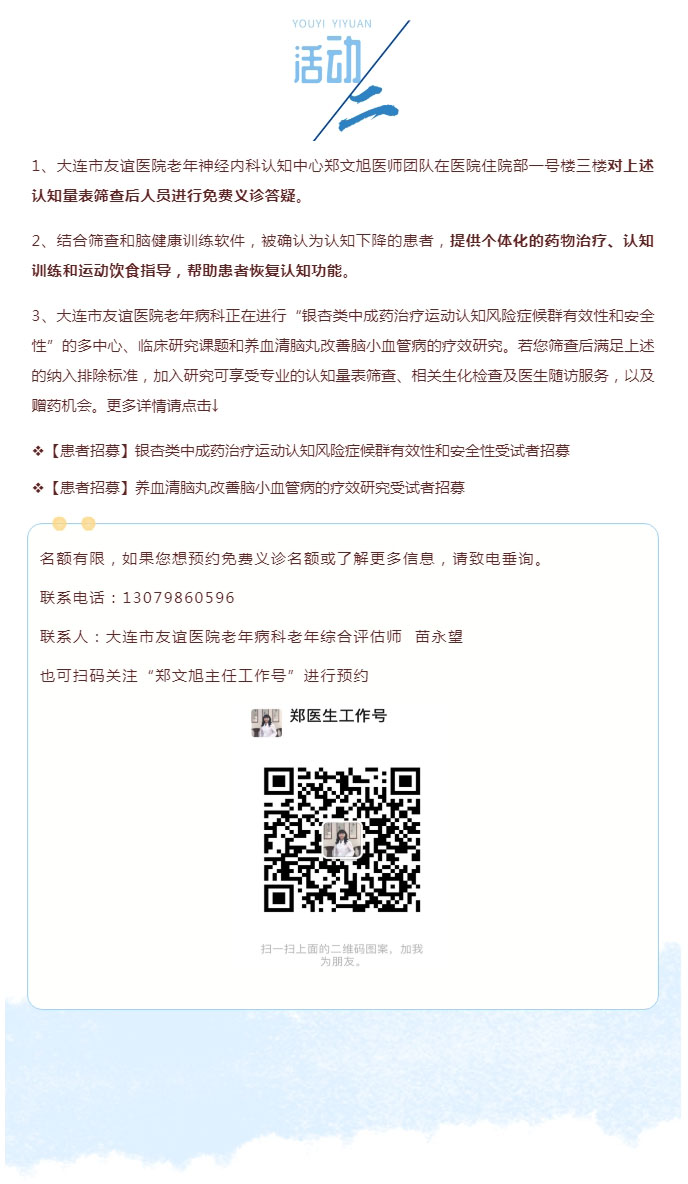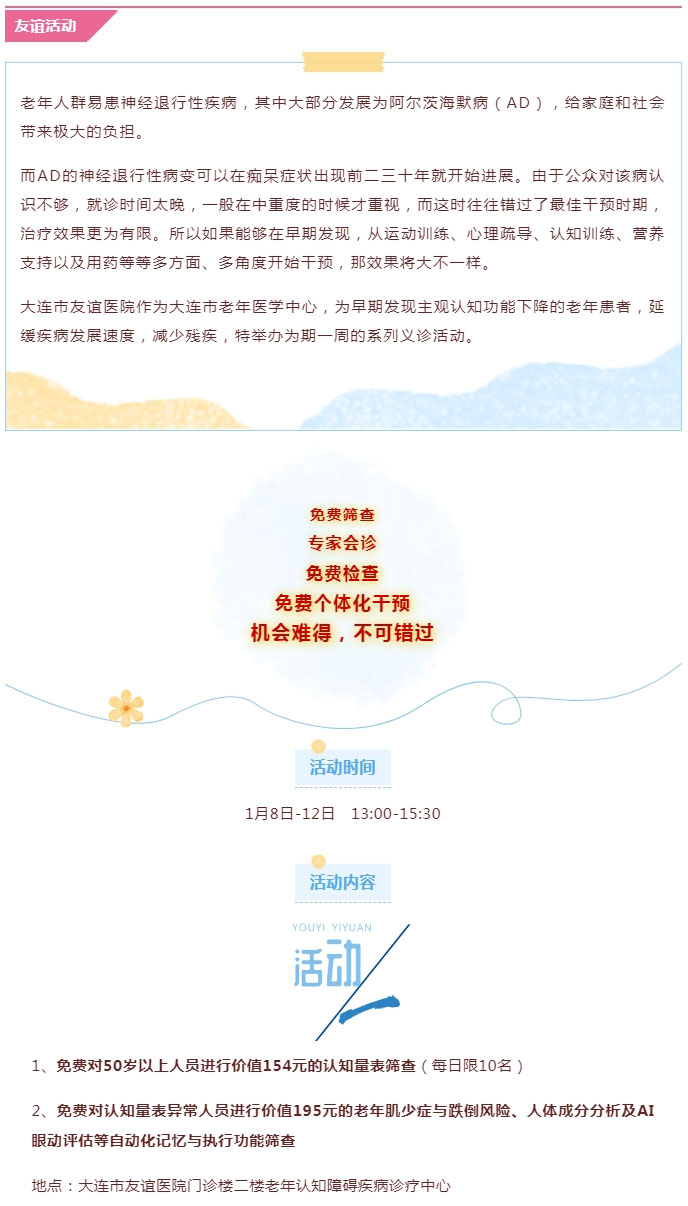 导读:【友谊义诊】抗击老年痴呆,免费“检查+专家诊”连送5天!速约!