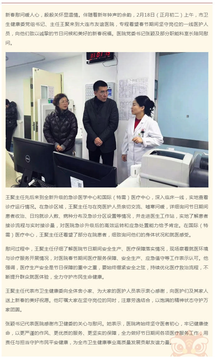 导读:情暖新春 守护安康——市卫健委王聚主任走访慰问市友谊医院一线医护人员