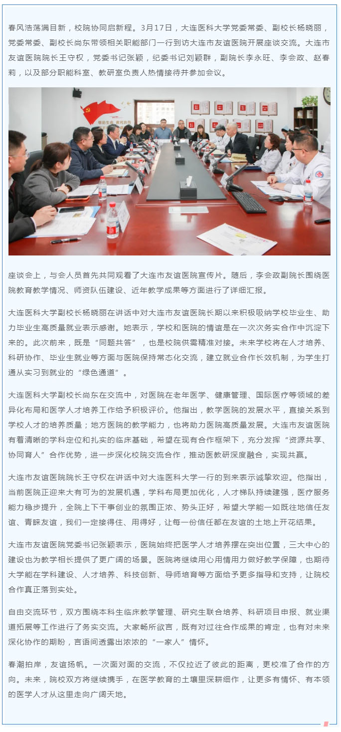 导读:春启·友约——大连医科大学校领导一行到访市友谊医院座谈交流