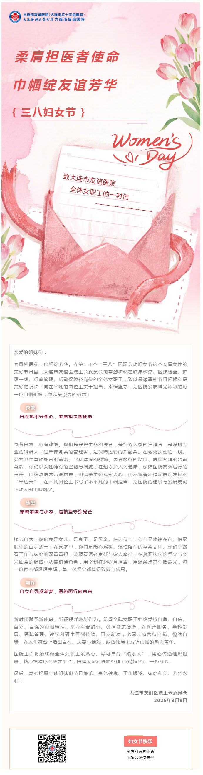 导读:柔肩担医者使命,巾帼绽友谊芳华——致大连市友谊医院全体女职工的一封信